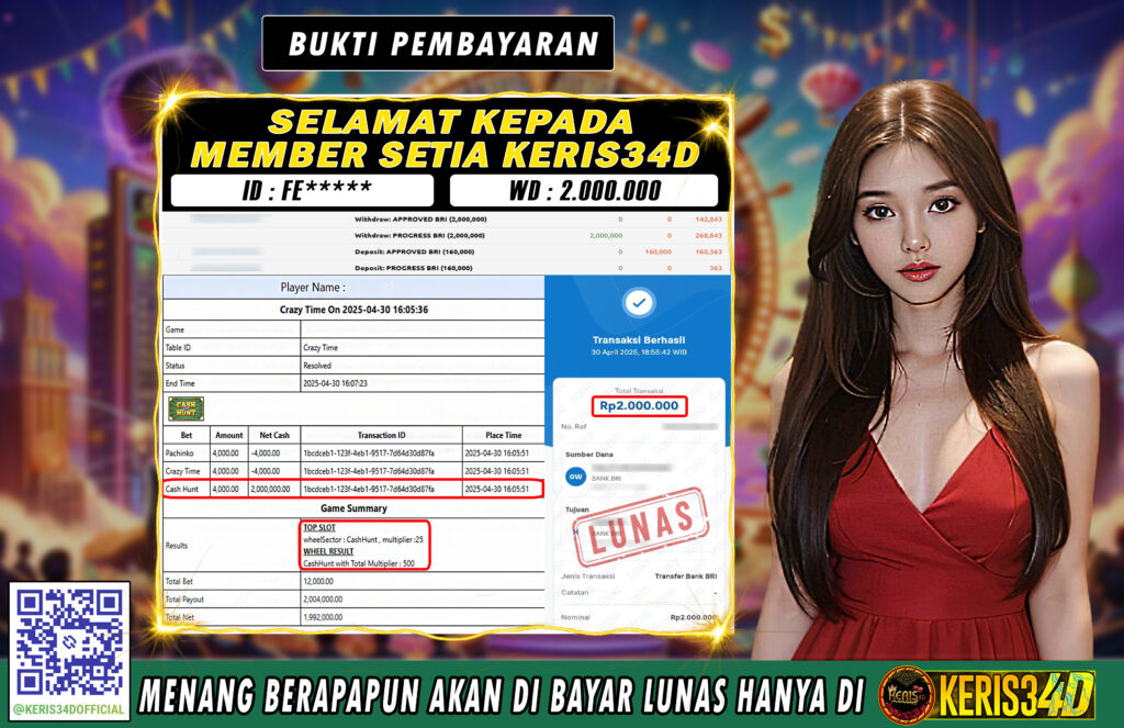 Setiap hari, member KERIS34D berhasil meraih jackpot besar dari berbagai provider slot ternama yang kami sediakan, seperti Pragmatic Play, Habanero, PG Soft, dan masih banyak lagi. Kami secara rutin menampilkan bukti screenshot atau rekapan kemenangan yang berhasil diraih, mulai dari kemenangan ratusan ribu hingga puluhan juta rupiah. Semua slip kemenangan ini kami hadirkan untuk membuktikan bahwa di KERIS34D, peluang menang itu nyata