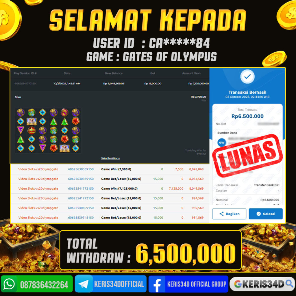 Setiap hari, member KERIS34D berhasil meraih jackpot besar dari berbagai provider slot ternama yang kami sediakan, seperti Pragmatic Play, Habanero, PG Soft, dan masih banyak lagi. Kami secara rutin menampilkan bukti screenshot atau rekapan kemenangan yang berhasil diraih, mulai dari kemenangan ratusan ribu hingga puluhan juta rupiah. Semua slip kemenangan ini kami hadirkan untuk membuktikan bahwa di KERIS34D, peluang menang itu nyata