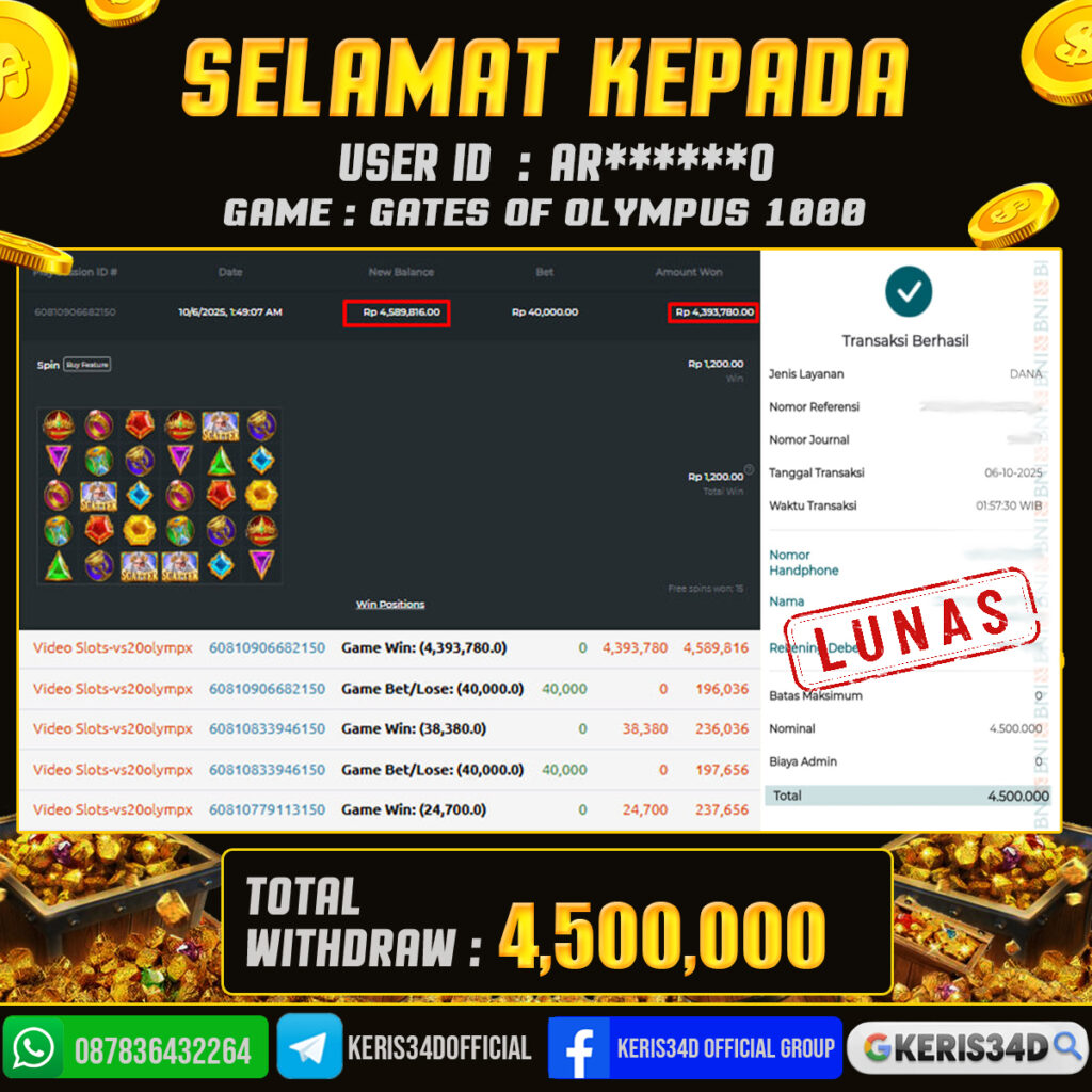 Setiap hari, member KERIS34D berhasil meraih jackpot besar dari berbagai provider slot ternama yang kami sediakan, seperti Pragmatic Play, Habanero, PG Soft, dan masih banyak lagi. Kami secara rutin menampilkan bukti screenshot atau rekapan kemenangan yang berhasil diraih, mulai dari kemenangan ratusan ribu hingga puluhan juta rupiah. Semua slip kemenangan ini kami hadirkan untuk membuktikan bahwa di KERIS34D, peluang menang itu nyata