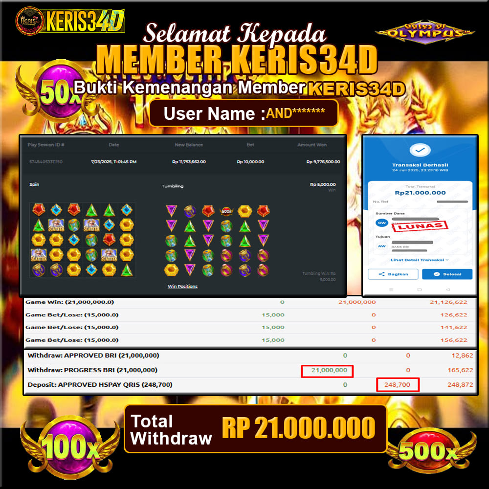 Setiap hari, member KERIS34D berhasil meraih jackpot besar dari berbagai provider slot ternama yang kami sediakan, seperti Pragmatic Play, Habanero, PG Soft, dan masih banyak lagi. Kami secara rutin menampilkan bukti screenshot atau rekapan kemenangan yang berhasil diraih, mulai dari kemenangan ratusan ribu hingga puluhan juta rupiah. Semua slip kemenangan ini kami hadirkan untuk membuktikan bahwa di KERIS34D, peluang menang itu nyata