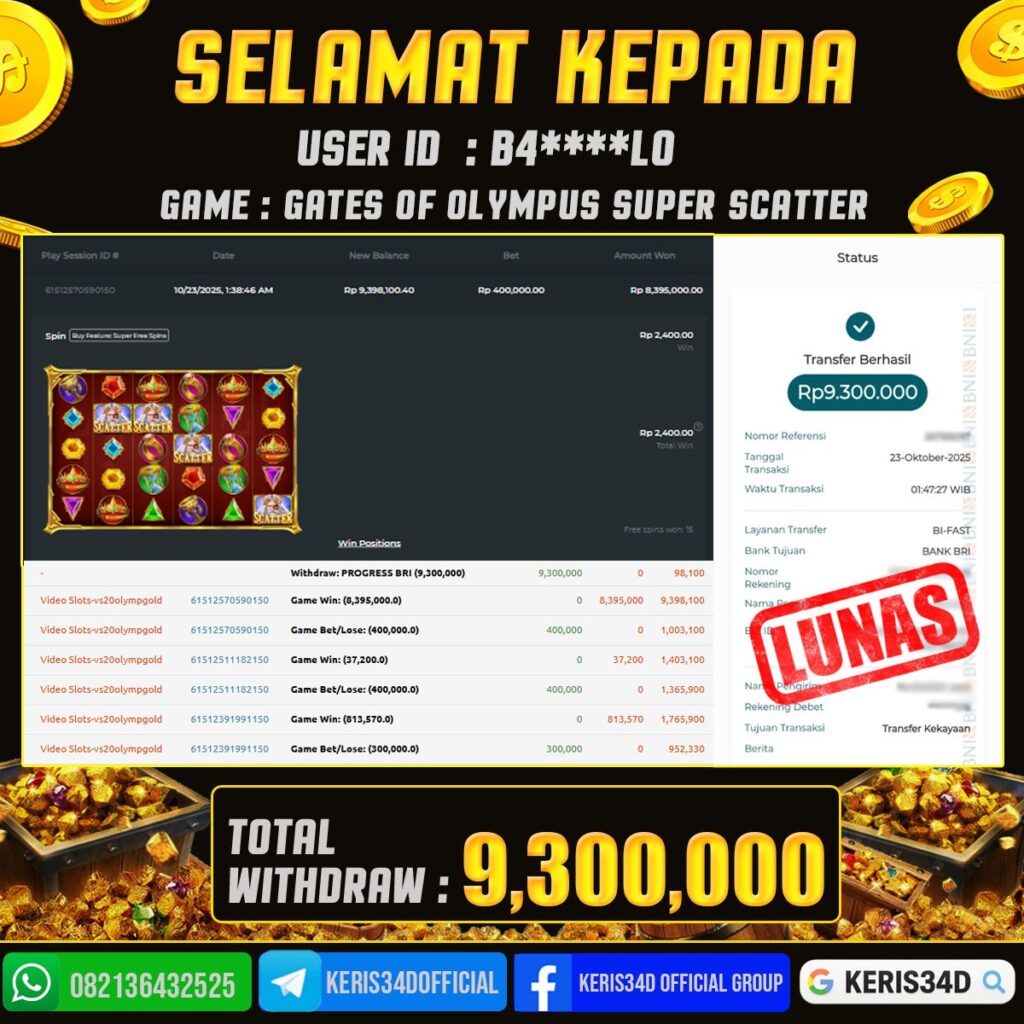 KERIS34D dikenal sebagai situs terpercaya yang selalu menghadirkan pengalaman bermain slot online yang aman, fair, dan berlisensi resmi. Di sini, kami tidak hanya sekadar memberikan janji, tapi bukti nyata berupa slip kemenangan yang dapat Anda lihat secara langsung.