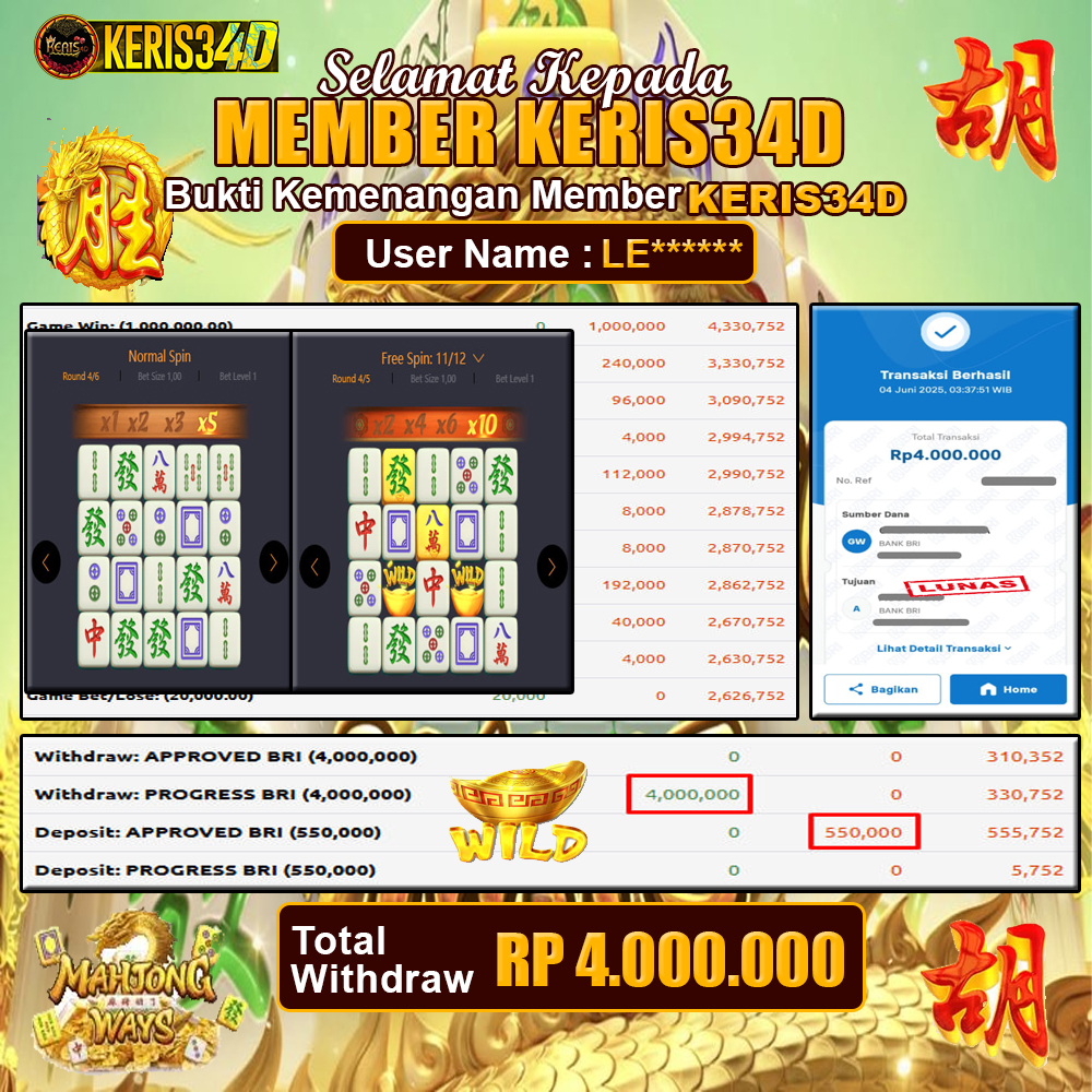 Setiap hari, member KERIS34D berhasil meraih jackpot besar dari berbagai provider slot ternama yang kami sediakan, seperti Pragmatic Play, Habanero, PG Soft, dan masih banyak lagi. Kami secara rutin menampilkan bukti screenshot atau rekapan kemenangan yang berhasil diraih, mulai dari kemenangan ratusan ribu hingga puluhan juta rupiah. Semua slip kemenangan ini kami hadirkan untuk membuktikan bahwa di KERIS34D, peluang menang itu nyata