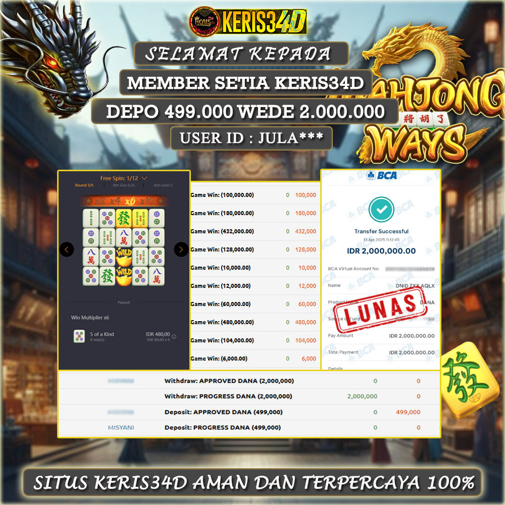Setiap hari, member KERIS34D berhasil meraih jackpot besar dari berbagai provider slot ternama yang kami sediakan, seperti Pragmatic Play, Habanero, PG Soft, dan masih banyak lagi. Kami secara rutin menampilkan bukti screenshot atau rekapan kemenangan yang berhasil diraih, mulai dari kemenangan ratusan ribu hingga puluhan juta rupiah. Semua slip kemenangan ini kami hadirkan untuk membuktikan bahwa di KERIS34D, peluang menang itu nyata