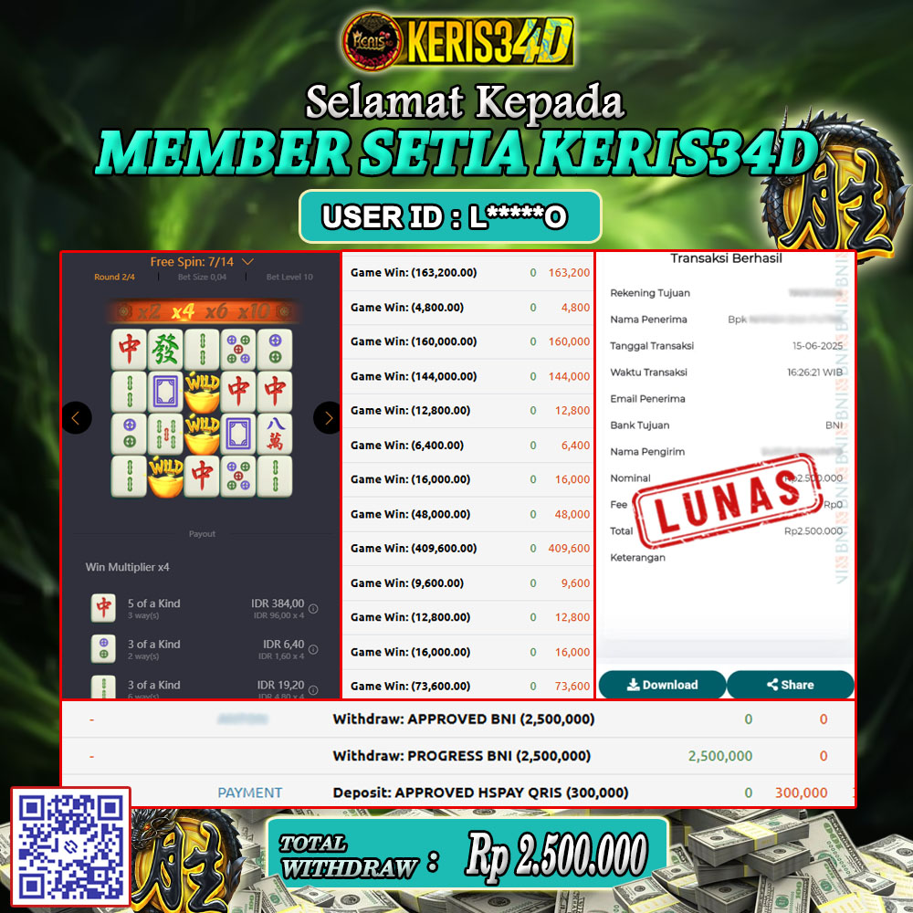 Setiap hari, member KERIS34D berhasil meraih jackpot besar dari berbagai provider slot ternama yang kami sediakan, seperti Pragmatic Play, Habanero, PG Soft, dan masih banyak lagi. Kami secara rutin menampilkan bukti screenshot atau rekapan kemenangan yang berhasil diraih, mulai dari kemenangan ratusan ribu hingga puluhan juta rupiah. Semua slip kemenangan ini kami hadirkan untuk membuktikan bahwa di KERIS34D, peluang menang itu nyata