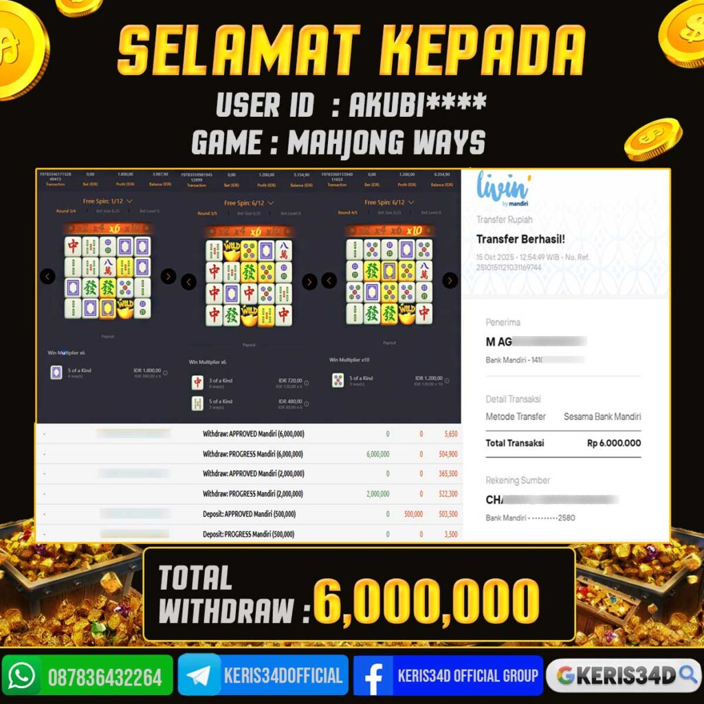 Setiap hari, member KERIS34D berhasil meraih jackpot besar dari berbagai provider slot ternama yang kami sediakan, seperti Pragmatic Play, Habanero, PG Soft, dan masih banyak lagi. Kami secara rutin menampilkan bukti screenshot atau rekapan kemenangan yang berhasil diraih, mulai dari kemenangan ratusan ribu hingga puluhan juta rupiah. Semua slip kemenangan ini kami hadirkan untuk membuktikan bahwa di KERIS34D, peluang menang itu nyata