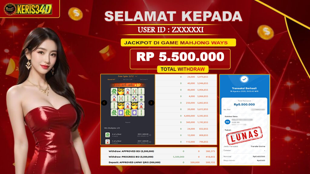 Setiap hari, member KERIS34D berhasil meraih jackpot besar dari berbagai provider slot ternama yang kami sediakan, seperti Pragmatic Play, Habanero, PG Soft, dan masih banyak lagi. Kami secara rutin menampilkan bukti screenshot atau rekapan kemenangan yang berhasil diraih, mulai dari kemenangan ratusan ribu hingga puluhan juta rupiah. Semua slip kemenangan ini kami hadirkan untuk membuktikan bahwa di KERIS34D, peluang menang itu nyata