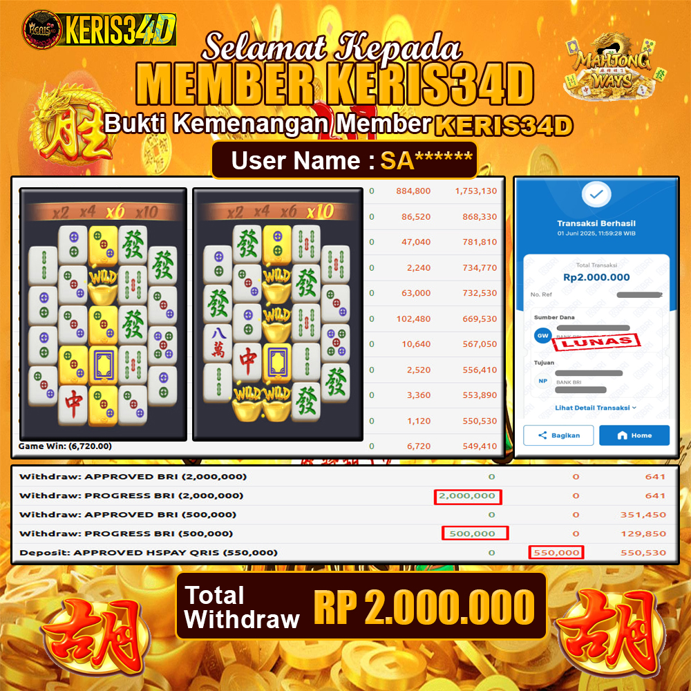Setiap hari, member KERIS34D berhasil meraih jackpot besar dari berbagai provider slot ternama yang kami sediakan, seperti Pragmatic Play, Habanero, PG Soft, dan masih banyak lagi. Kami secara rutin menampilkan bukti screenshot atau rekapan kemenangan yang berhasil diraih, mulai dari kemenangan ratusan ribu hingga puluhan juta rupiah. Semua slip kemenangan ini kami hadirkan untuk membuktikan bahwa di KERIS34D, peluang menang itu nyata