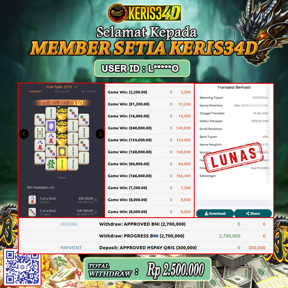 Setiap hari, member KERIS34D berhasil meraih jackpot besar dari berbagai provider slot ternama yang kami sediakan, seperti Pragmatic Play, Habanero, PG Soft, dan masih banyak lagi. Kami secara rutin menampilkan bukti screenshot atau rekapan kemenangan yang berhasil diraih, mulai dari kemenangan ratusan ribu hingga puluhan juta rupiah. Semua slip kemenangan ini kami hadirkan untuk membuktikan bahwa di KERIS34D, peluang menang itu nyata