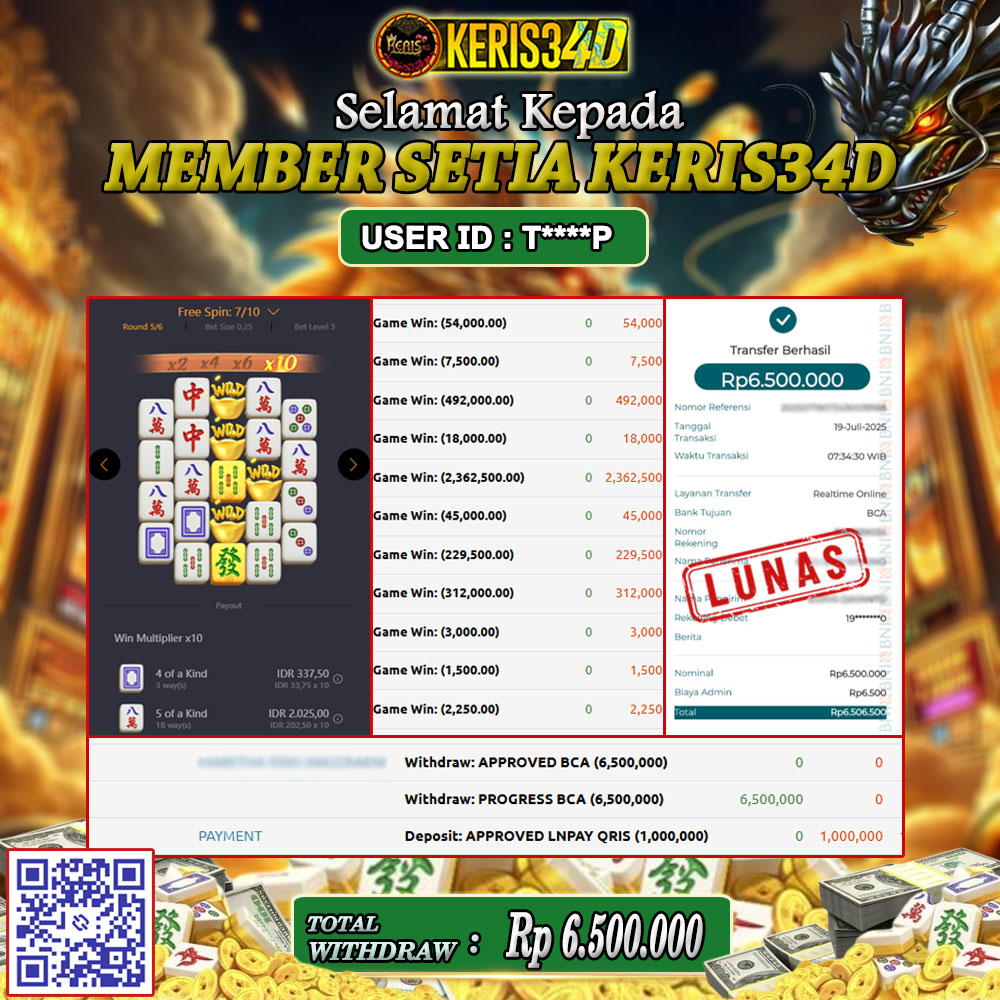 Setiap hari, member KERIS34D berhasil meraih jackpot besar dari berbagai provider slot ternama yang kami sediakan, seperti Pragmatic Play, Habanero, PG Soft, dan masih banyak lagi. Kami secara rutin menampilkan bukti screenshot atau rekapan kemenangan yang berhasil diraih, mulai dari kemenangan ratusan ribu hingga puluhan juta rupiah. Semua slip kemenangan ini kami hadirkan untuk membuktikan bahwa di KERIS34D, peluang menang itu nyata