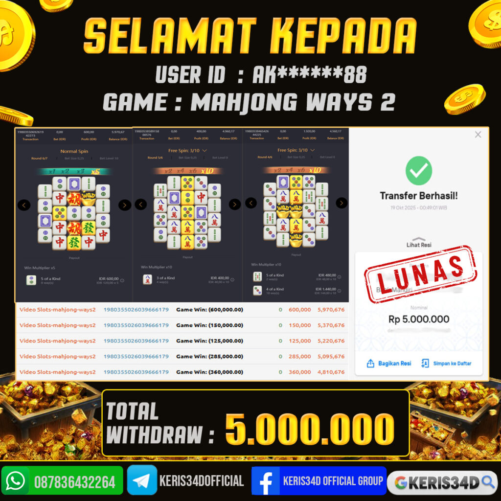 Setiap hari, member KERIS34D berhasil meraih jackpot besar dari berbagai provider slot ternama yang kami sediakan, seperti Pragmatic Play, Habanero, PG Soft, dan masih banyak lagi. Kami secara rutin menampilkan bukti screenshot atau rekapan kemenangan yang berhasil diraih, mulai dari kemenangan ratusan ribu hingga puluhan juta rupiah. Semua slip kemenangan ini kami hadirkan untuk membuktikan bahwa di KERIS34D, peluang menang itu nyata