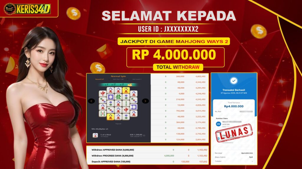 KERIS34D dikenal sebagai situs terpercaya yang selalu menghadirkan pengalaman bermain slot online yang aman, fair, dan berlisensi resmi. Di sini, kami tidak hanya sekadar memberikan janji, tapi bukti nyata berupa slip kemenangan yang dapat Anda lihat secara langsung.