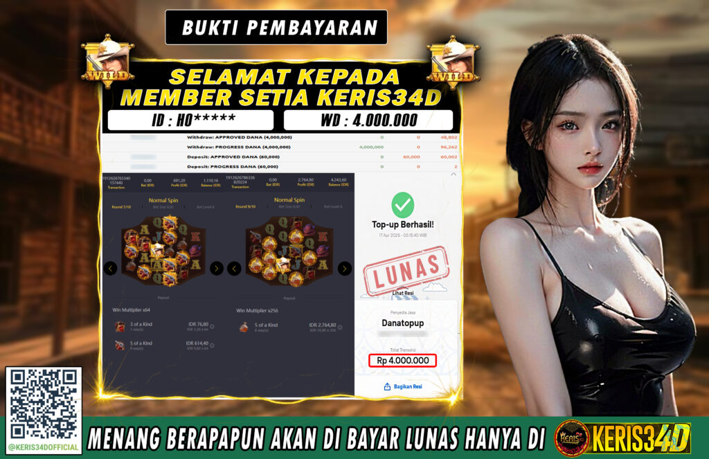 KERIS34D dikenal sebagai situs terpercaya yang selalu menghadirkan pengalaman bermain slot online yang aman, fair, dan berlisensi resmi. Di sini, kami tidak hanya sekadar memberikan janji, tapi bukti nyata berupa slip kemenangan yang dapat Anda lihat secara langsung.
